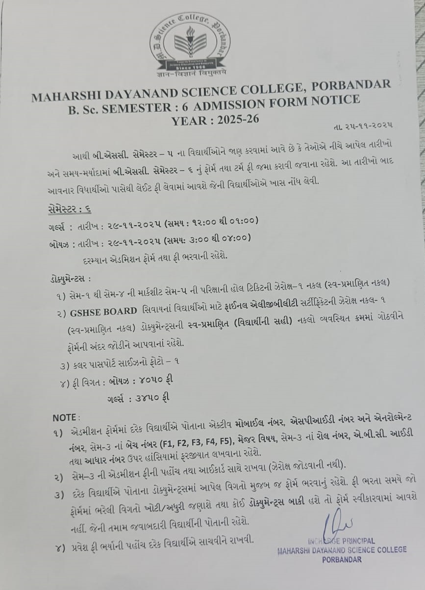 B.Sc. Semester - 6 Admission Form Notice Year 2025 - 26