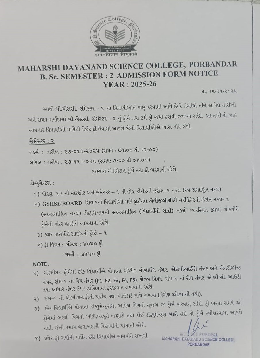 B.Sc. Semester - 2 Admission Form Notice Year 2025 - 26