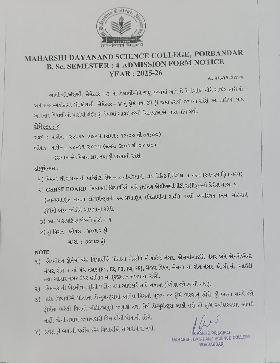 B.Sc. Semester - 4 Admission Form Notice Year 2025 - 26