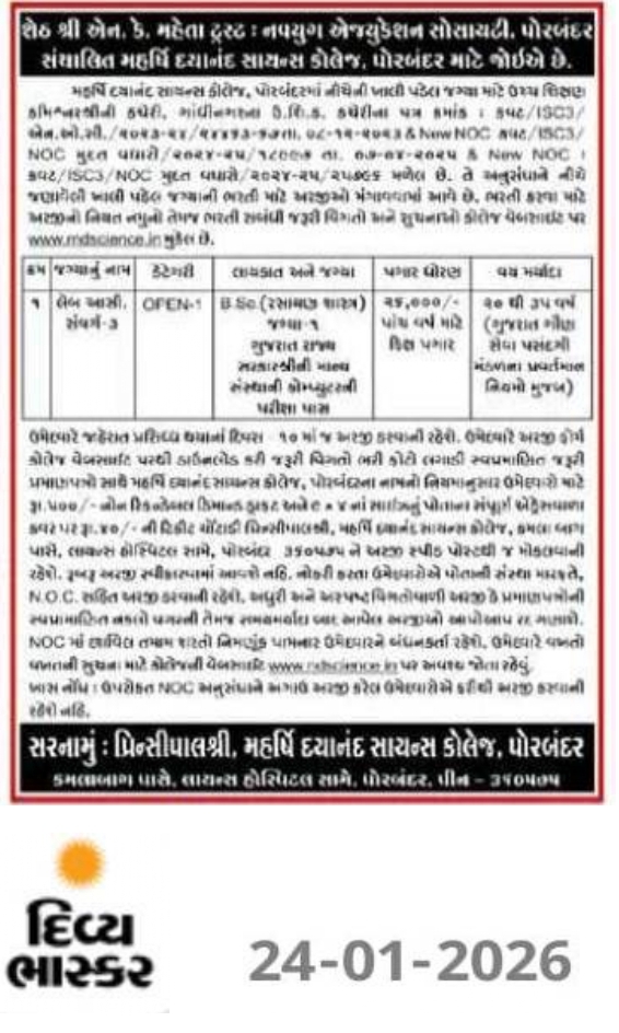 લેબ-આસિસ્ટન્ટ વર્ગ -3 (રસાયણશાસ્ત્ર) અંગે જાહેરાત